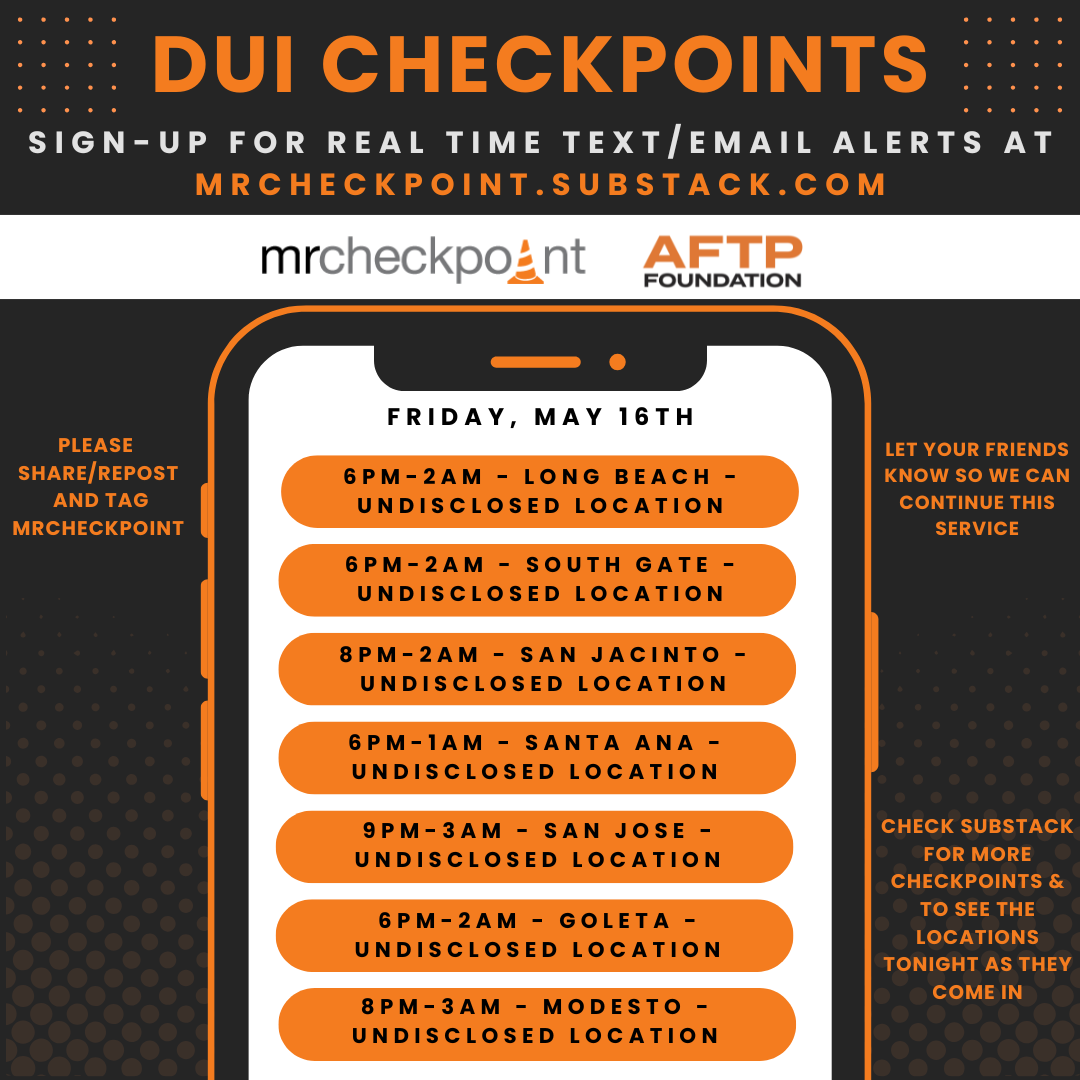 DUI Checkpoints Friday May 16th 2025